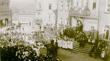 Vor dem alten Rathaus wurden die Glocken von Stadt- und Kirchevätern in Empfang genommen. Nach dem feierlichen Empfang und der Weihe, zog man die Glocken auf den Turm und dort läuteten sie zwei Tage später zum ersten Mal.